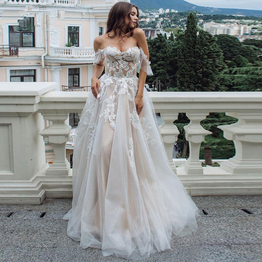 Champagne Boho Wedding Dress Lace Appliques Tulle Backless Beach Wedding Gowns Off Shoulder Princess Bridal Dress