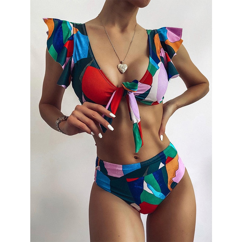 Pay in 4 instalments with AfterPay, Buy Now Pay Later2 Piece Geometry print swimsuit Sexy ruffle bikini High waist swimwear Bandeau knot bathing suit Vintage beach wear