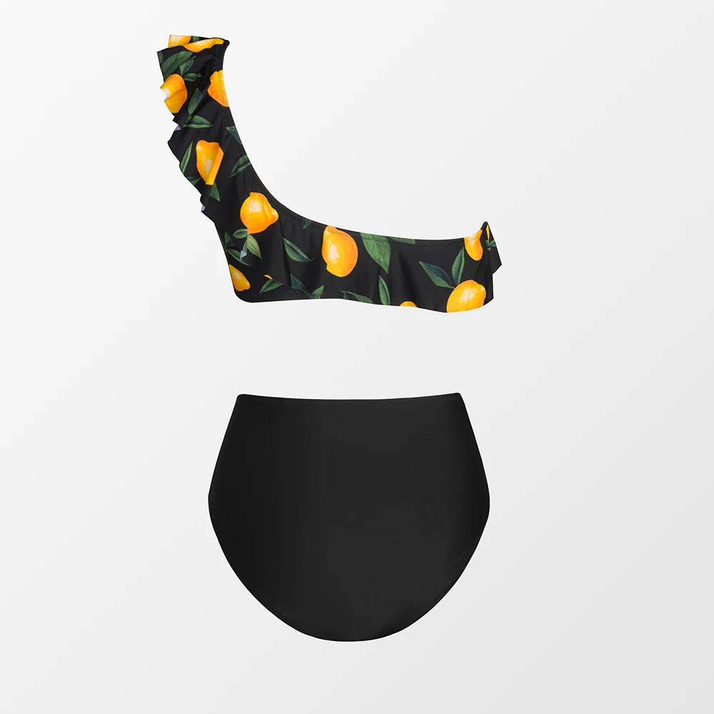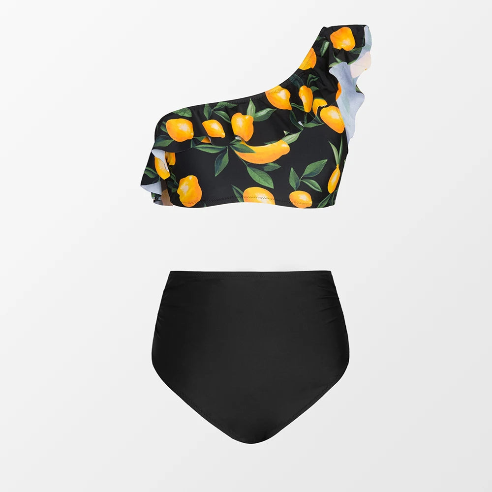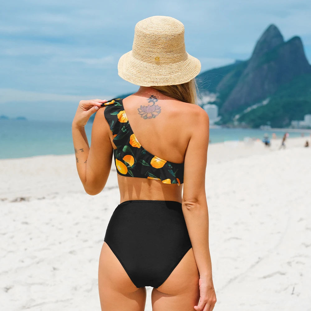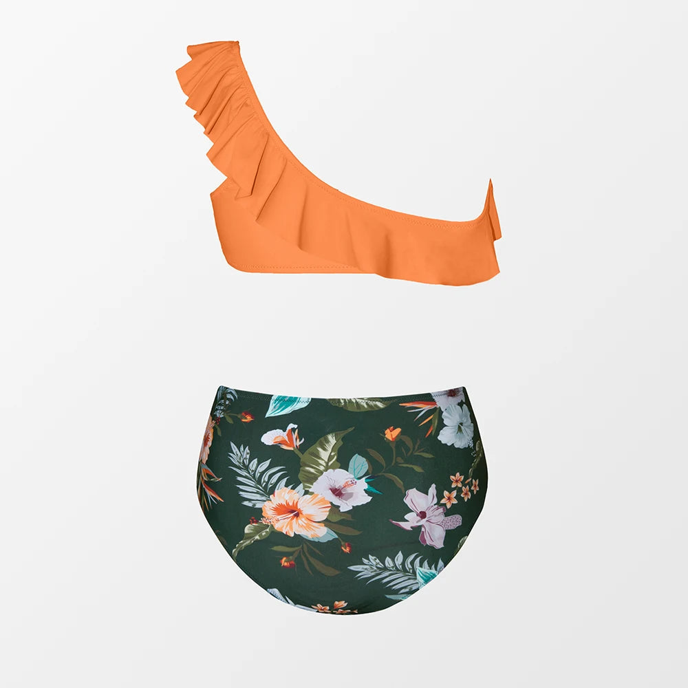 Green Floral One Shoulder Bikini Sets High Waist Swimsuit Two Pieces Swimwear Women Bathing Suit