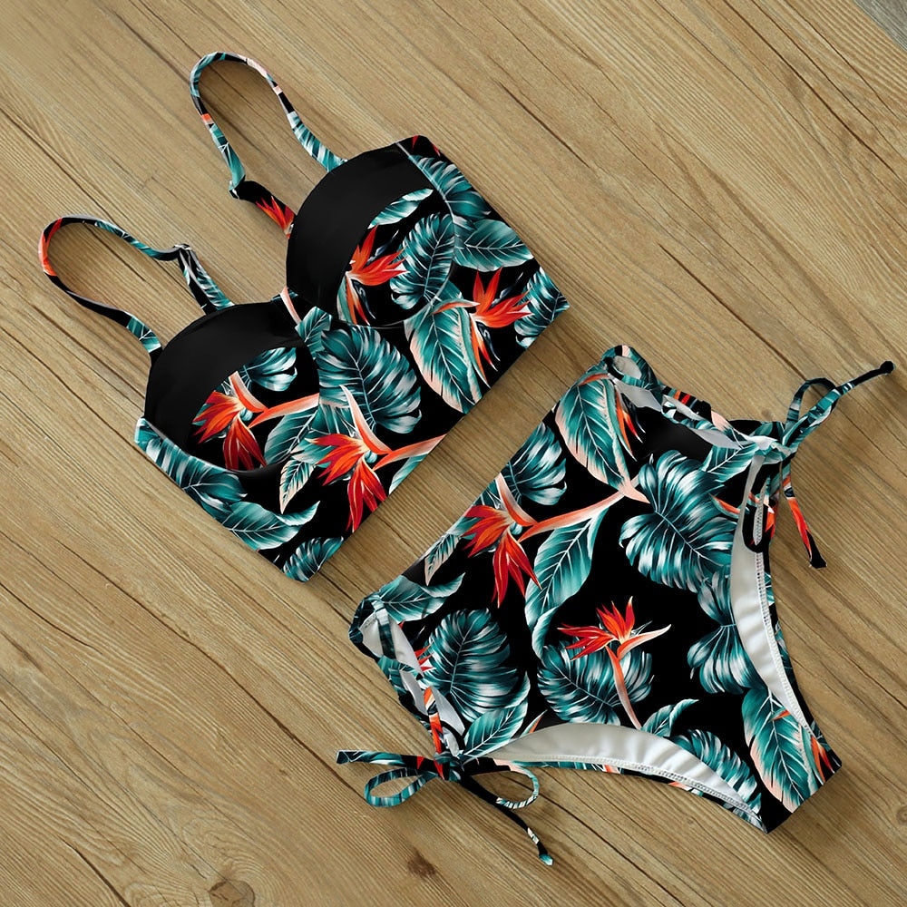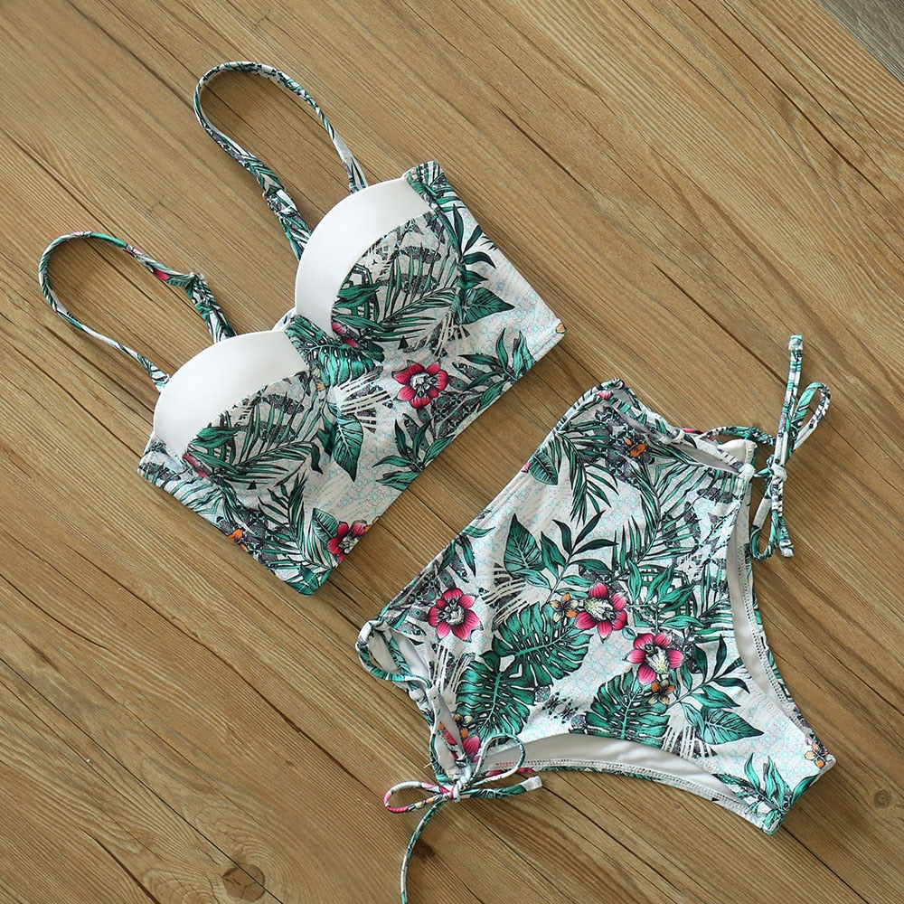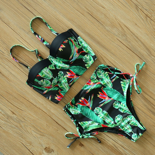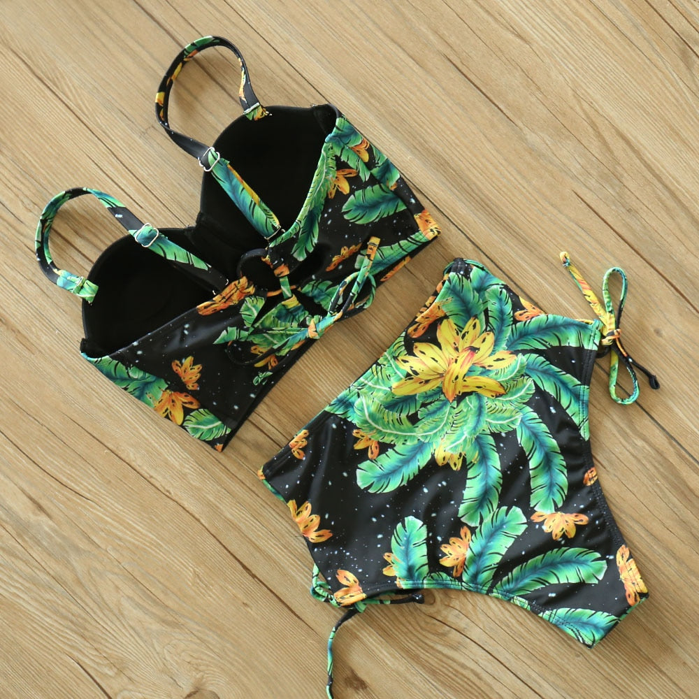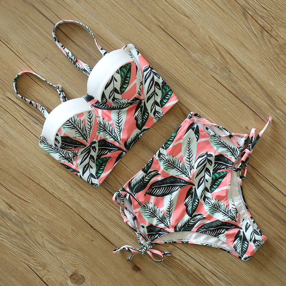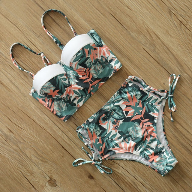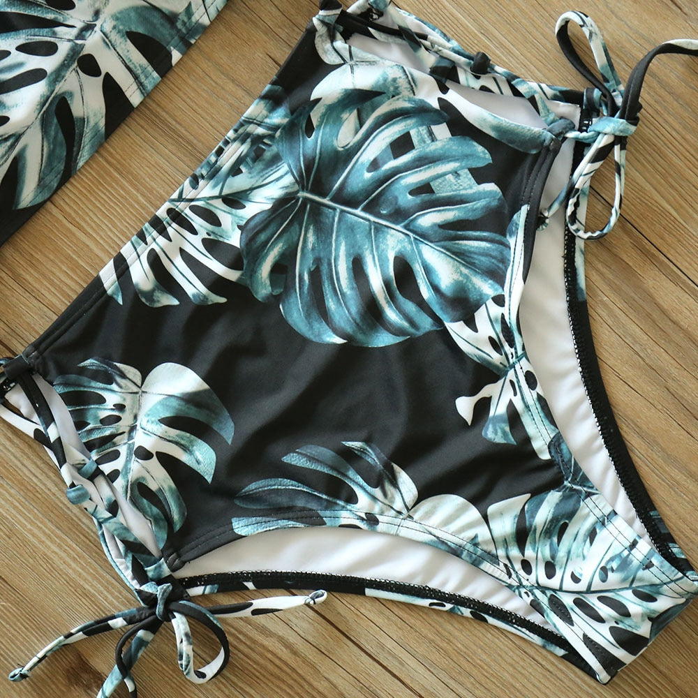 2 Piece Leaf Print Bikinis Women Swimsuit Vintage Retro Bathing Suit Halter High Waist Swimwear