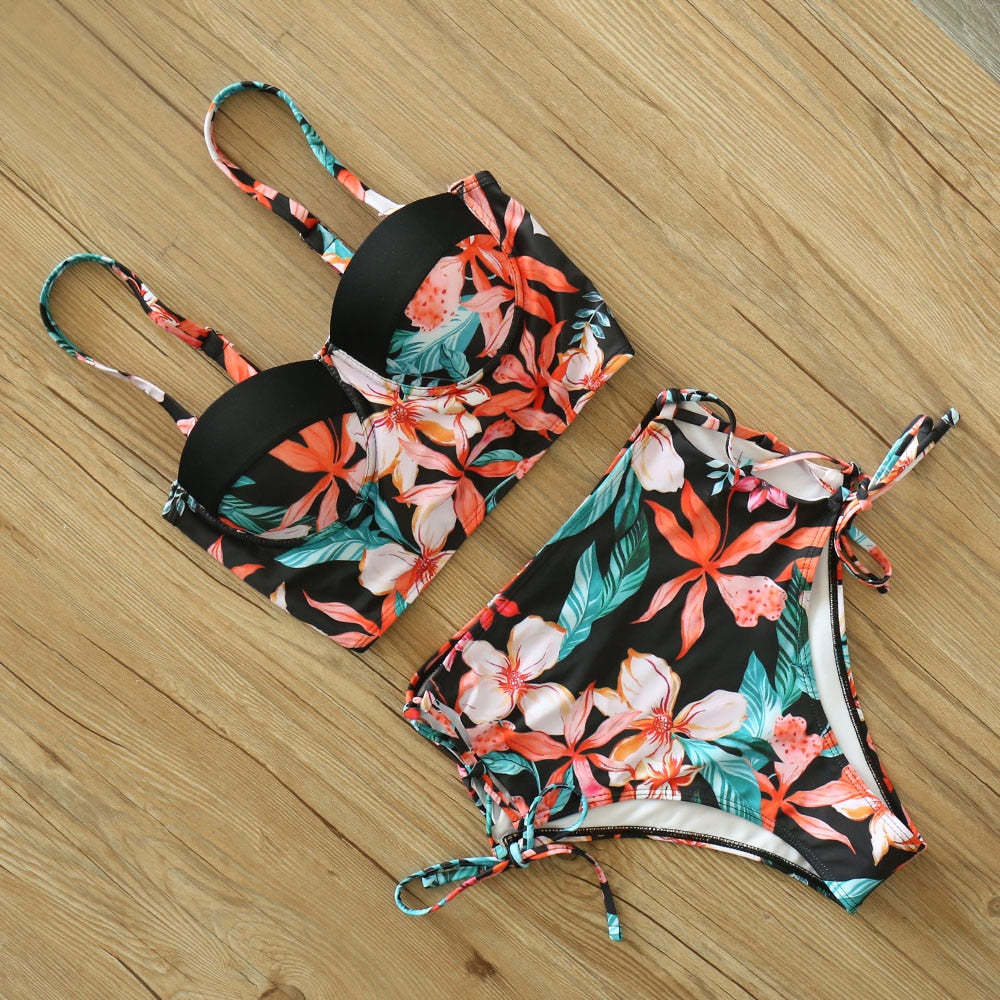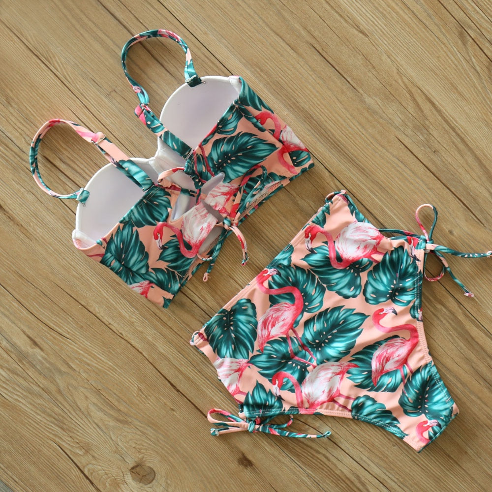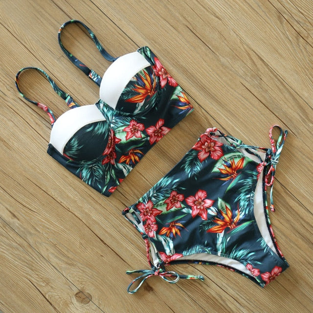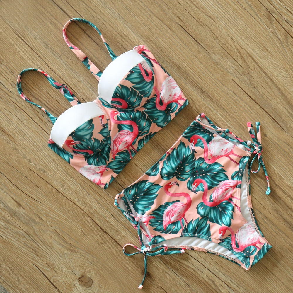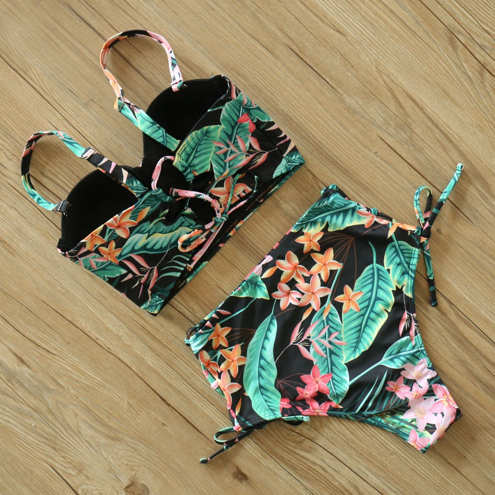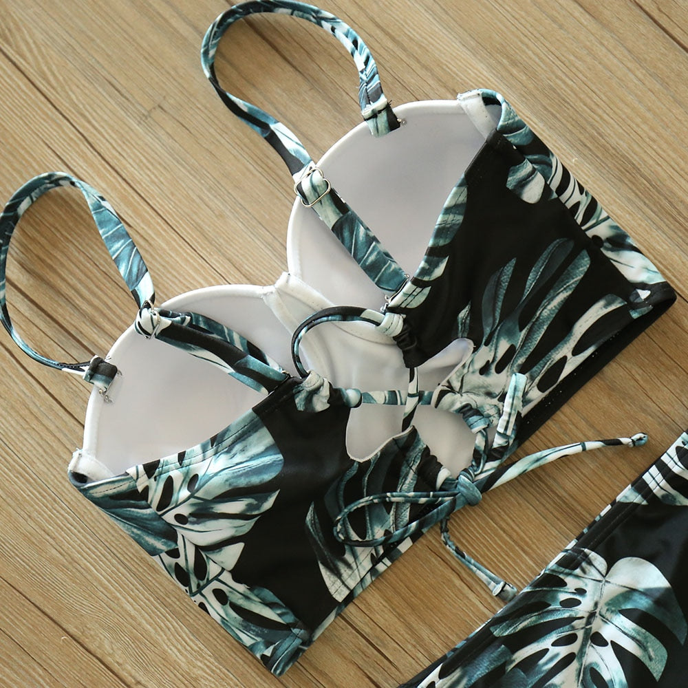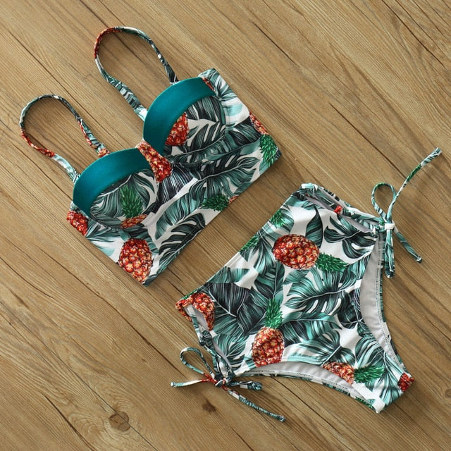 2 Piece Leaf Print Bikinis Women Swimsuit Vintage Retro Bathing Suit Halter High Waist Swimwear