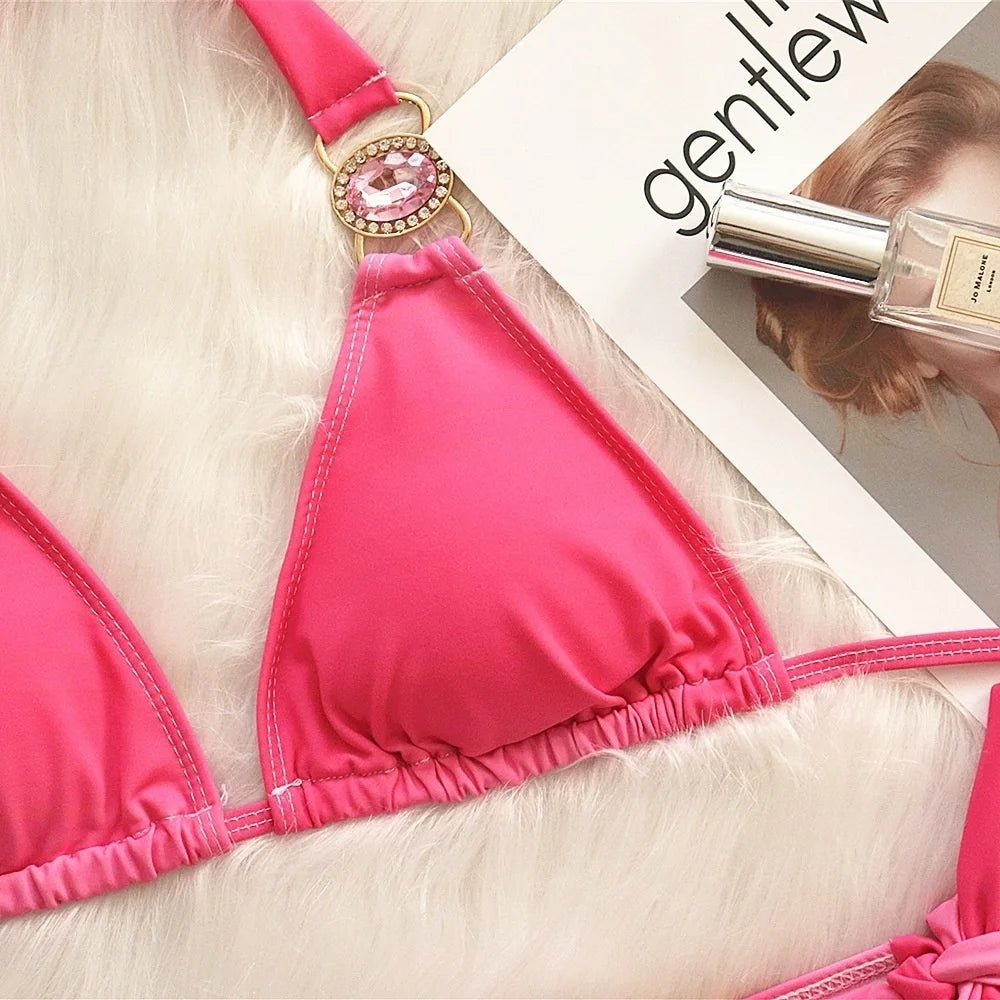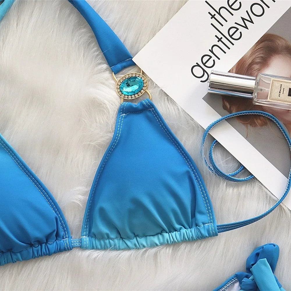 2 Piece Rhinestone Swimsuit Crystal Thong String Bikini Set Swimwear Beach Wear Bathing Suit