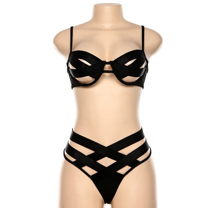 2 Piece See Through Lingerie Underwear Set Bra Set String Transparent Bandage Hollow Out Female Bra and Panty Set