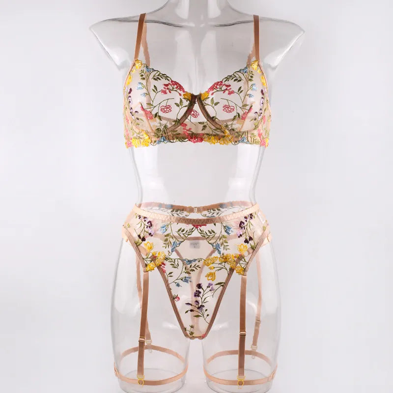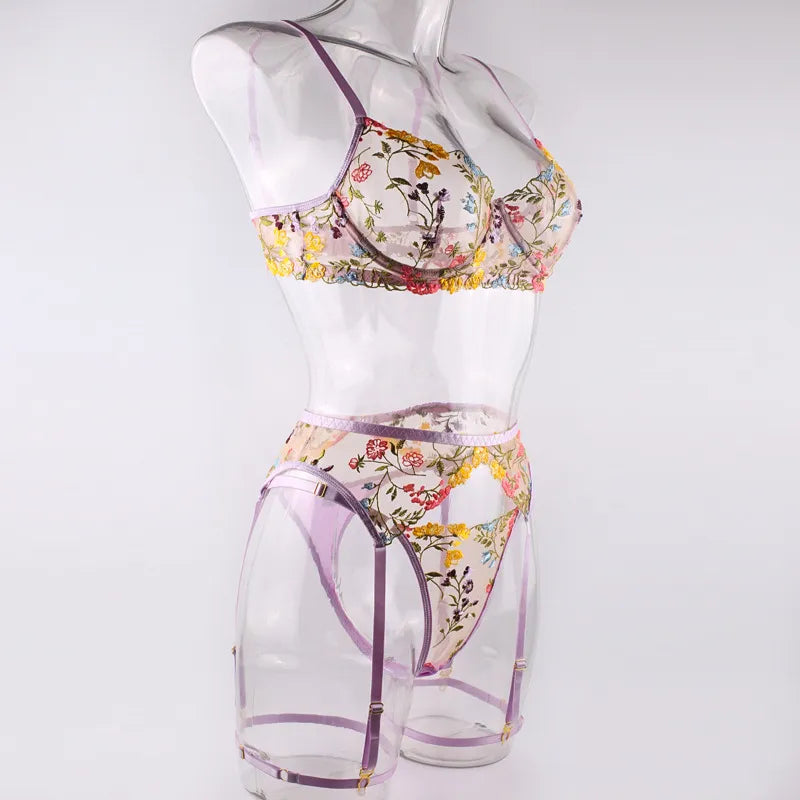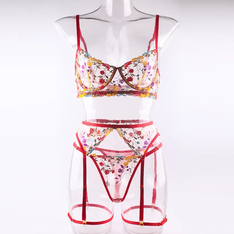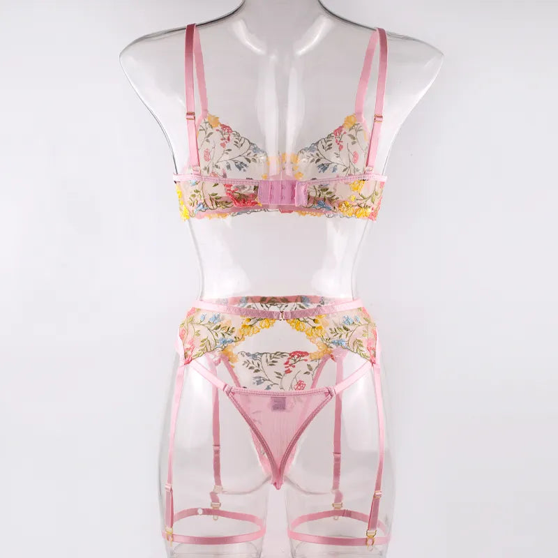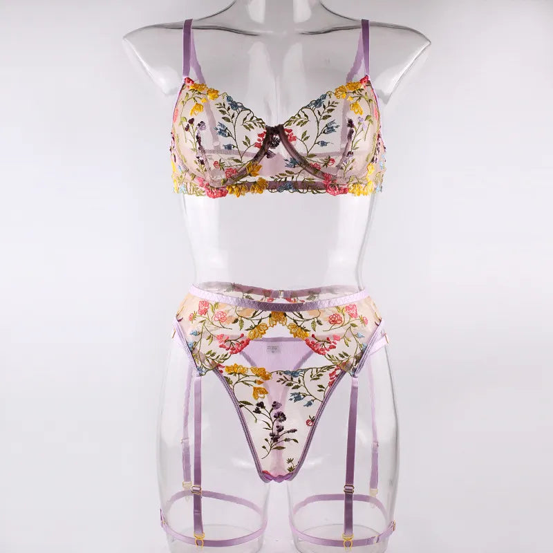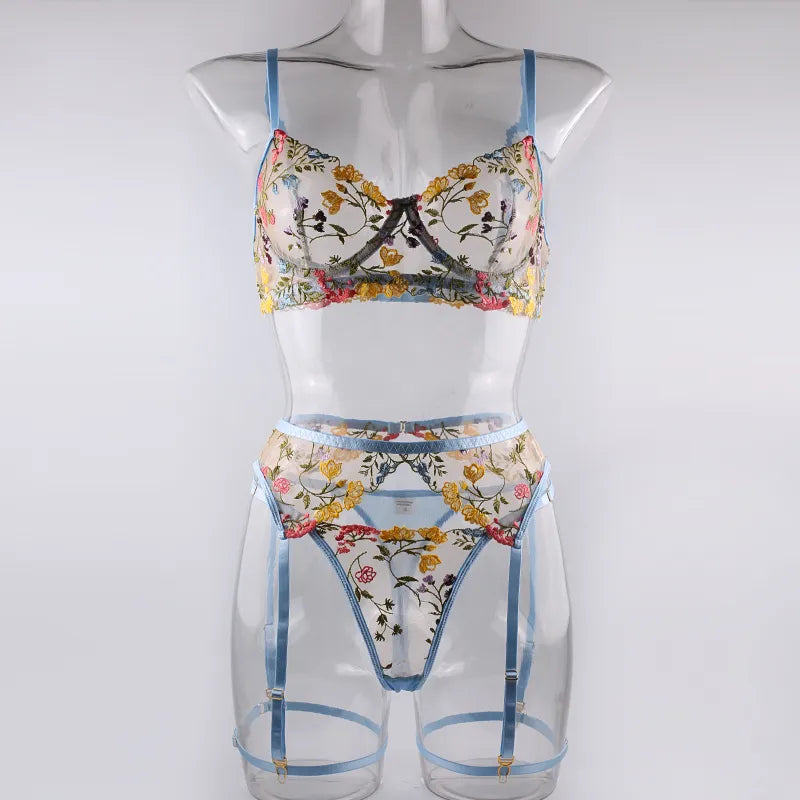 3 Piece Lingerie Sensual Lace Underwear Transparent Embroidery Garters Fancy Beautiful Bra Panties Intimate Set
