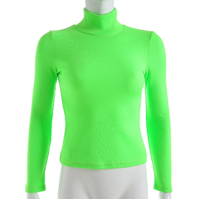 Autumn Winter turtleneck long sleeve neon green t-shirts knitted neon top tee shirt basic Top