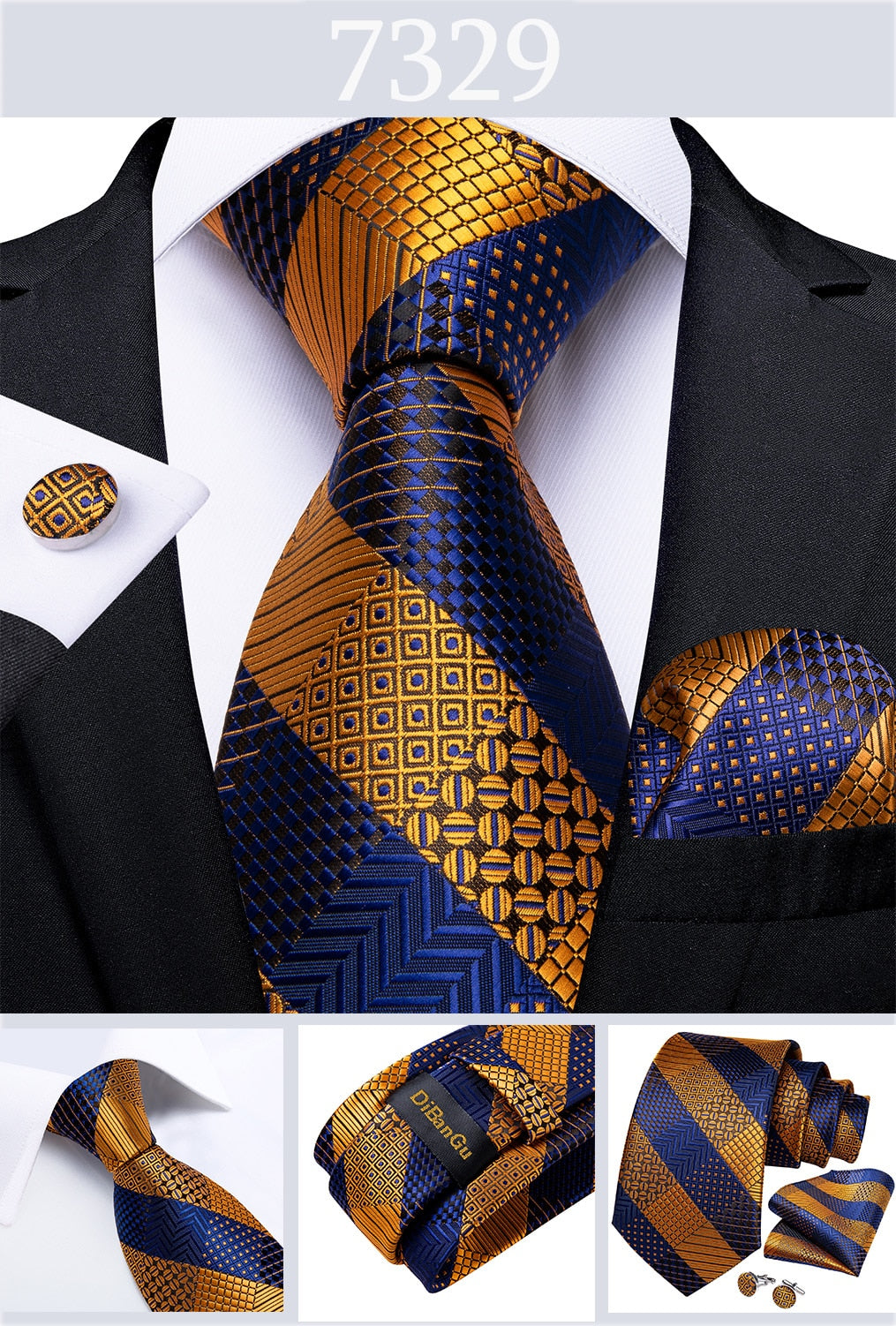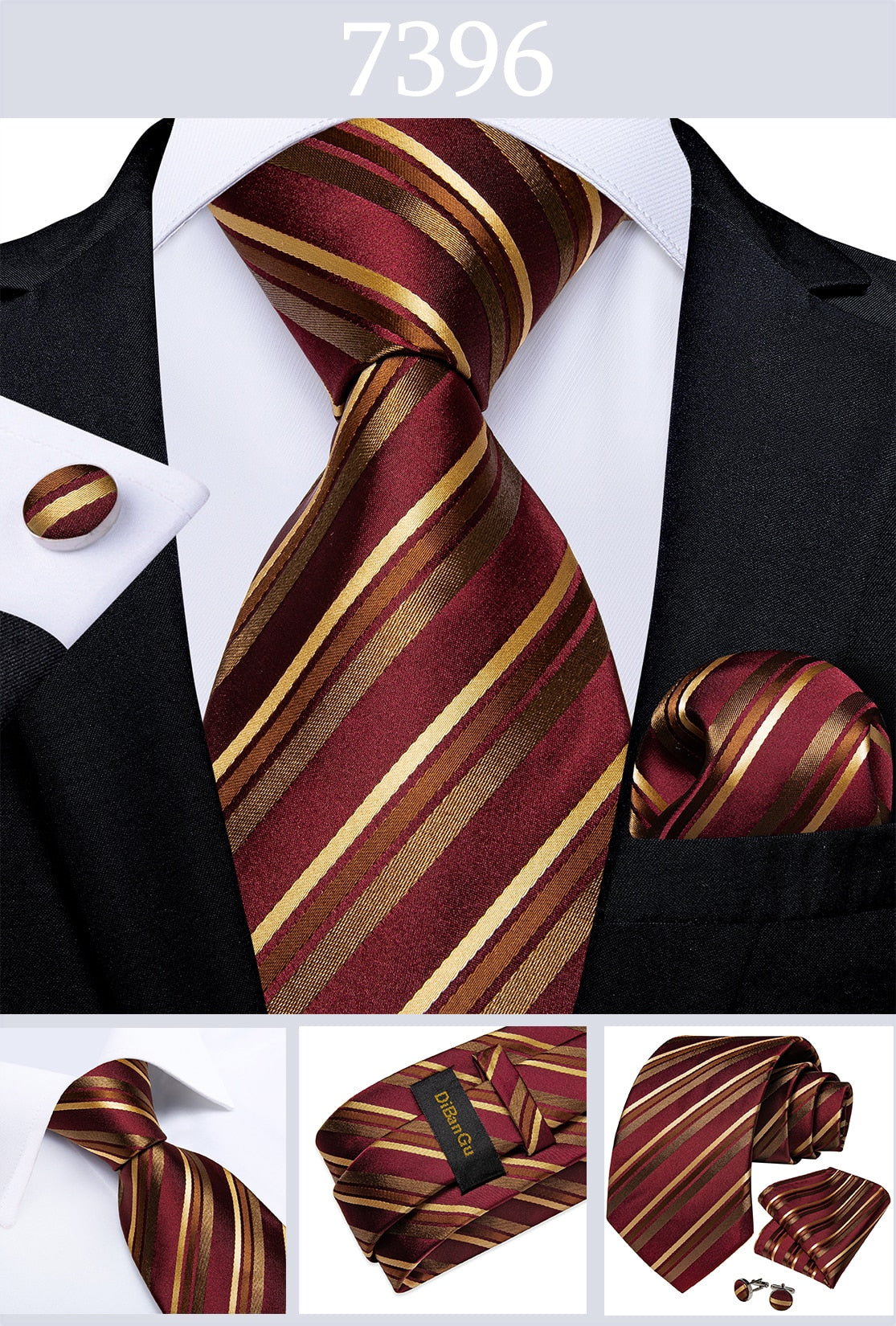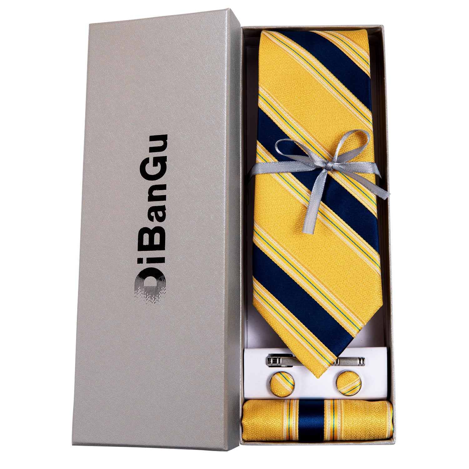 3 Piece Designer Men's Wedding Tie Gold Black Striped Silk Neck Ties For Men Hanky Cufflinks Set Business Party Wear