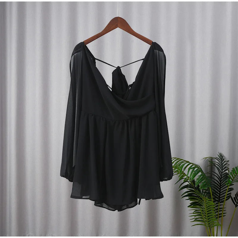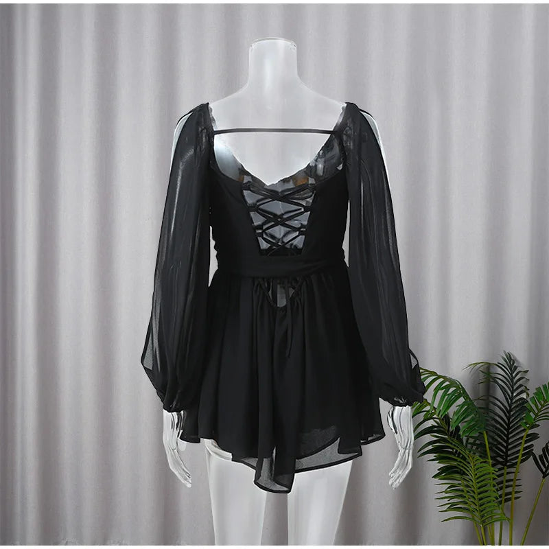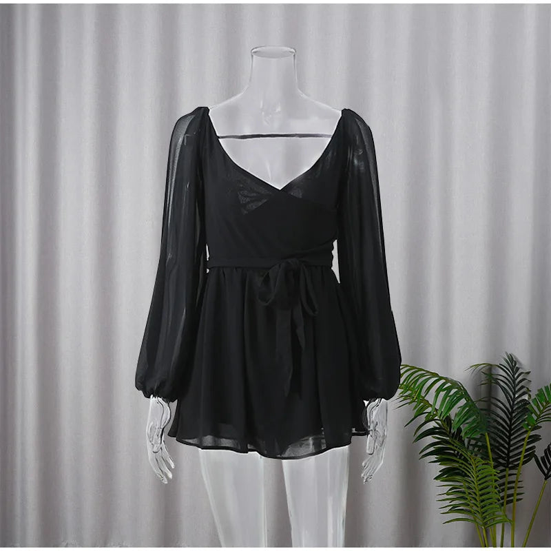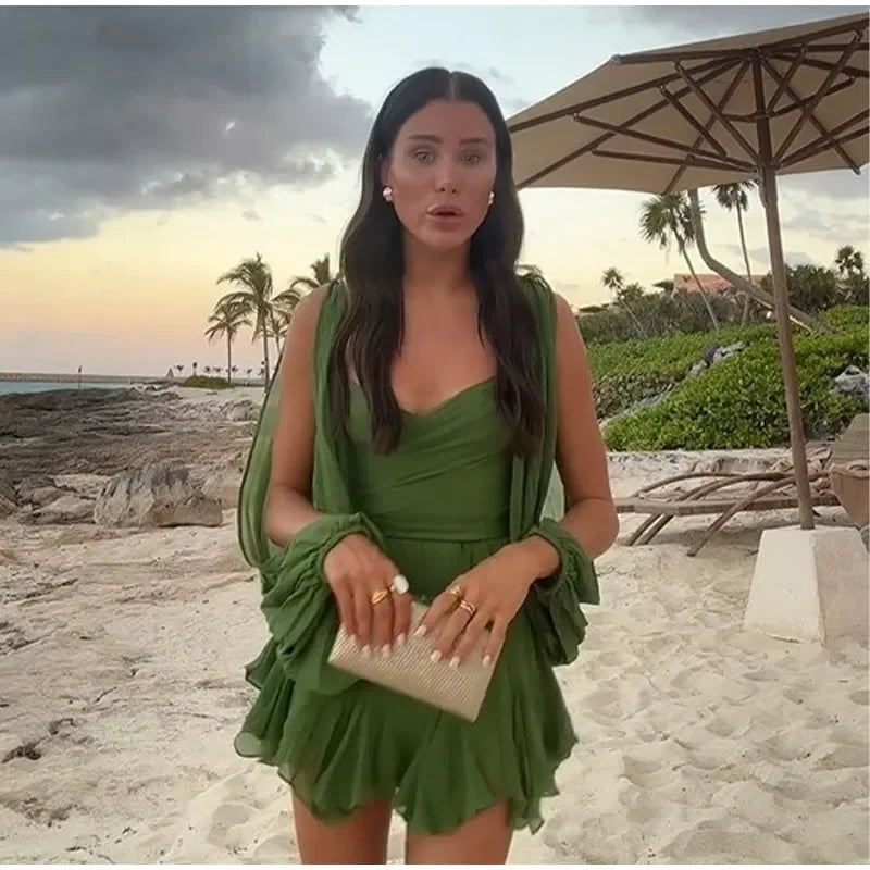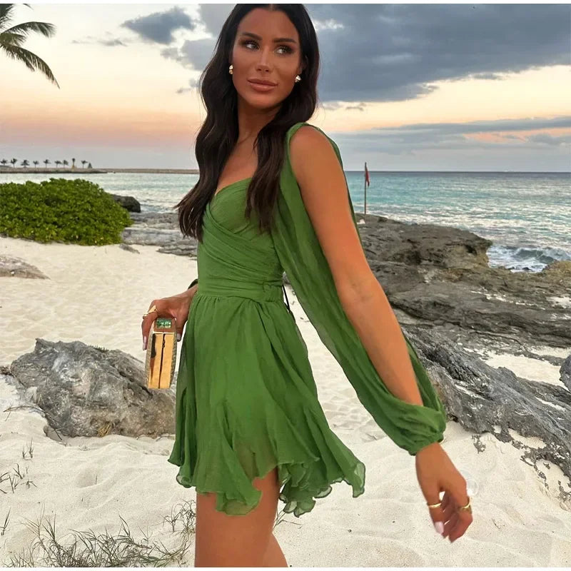 Pay in 4 instalments with AfterPay, Buy Now Pay LaterGreen Pleated Mini Elegant V-neck Split Long Sleeve A-line Summer Lady Solid Backless Lace Up Dress