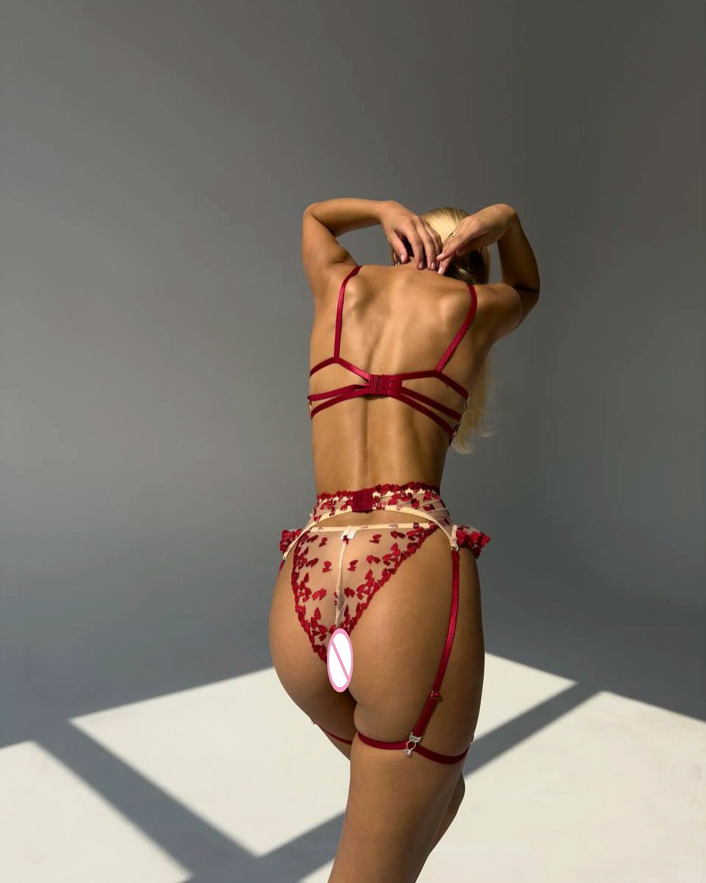 4 Piece Lingerie Sheer Lace Embroidery Underwear Ruffle Intimate Outfits Lingerie Set