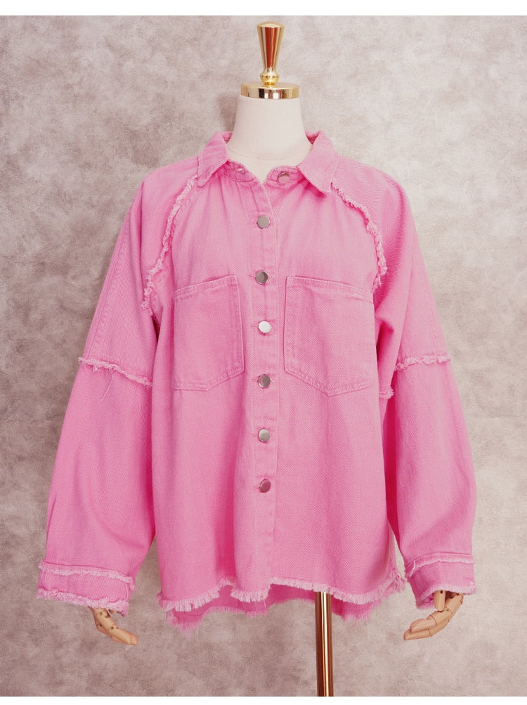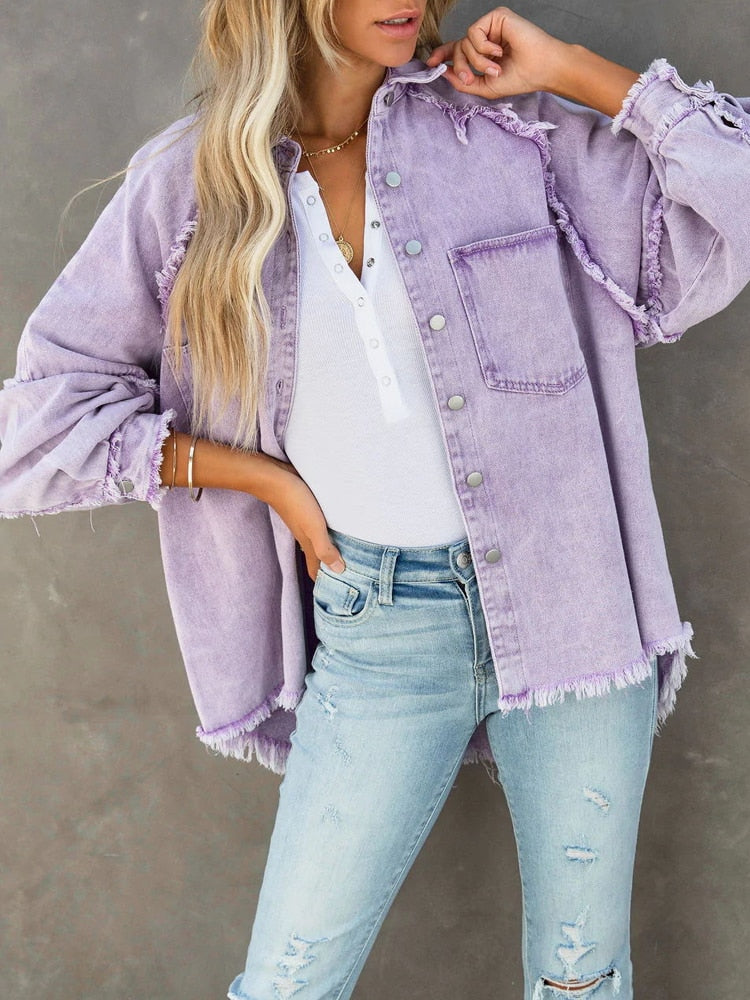 Loose Turn-down Collar Denim Jacket Coat Casual Denim Jacket Long Sleeve Tassel Solid washed Tops