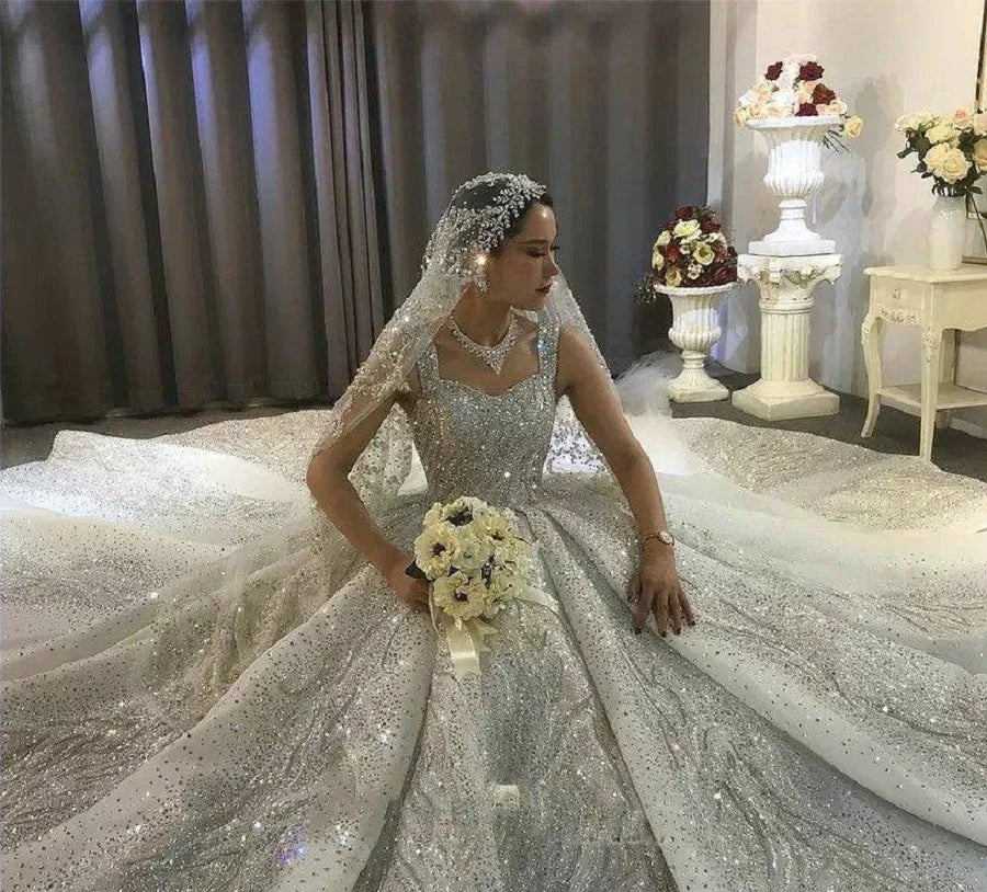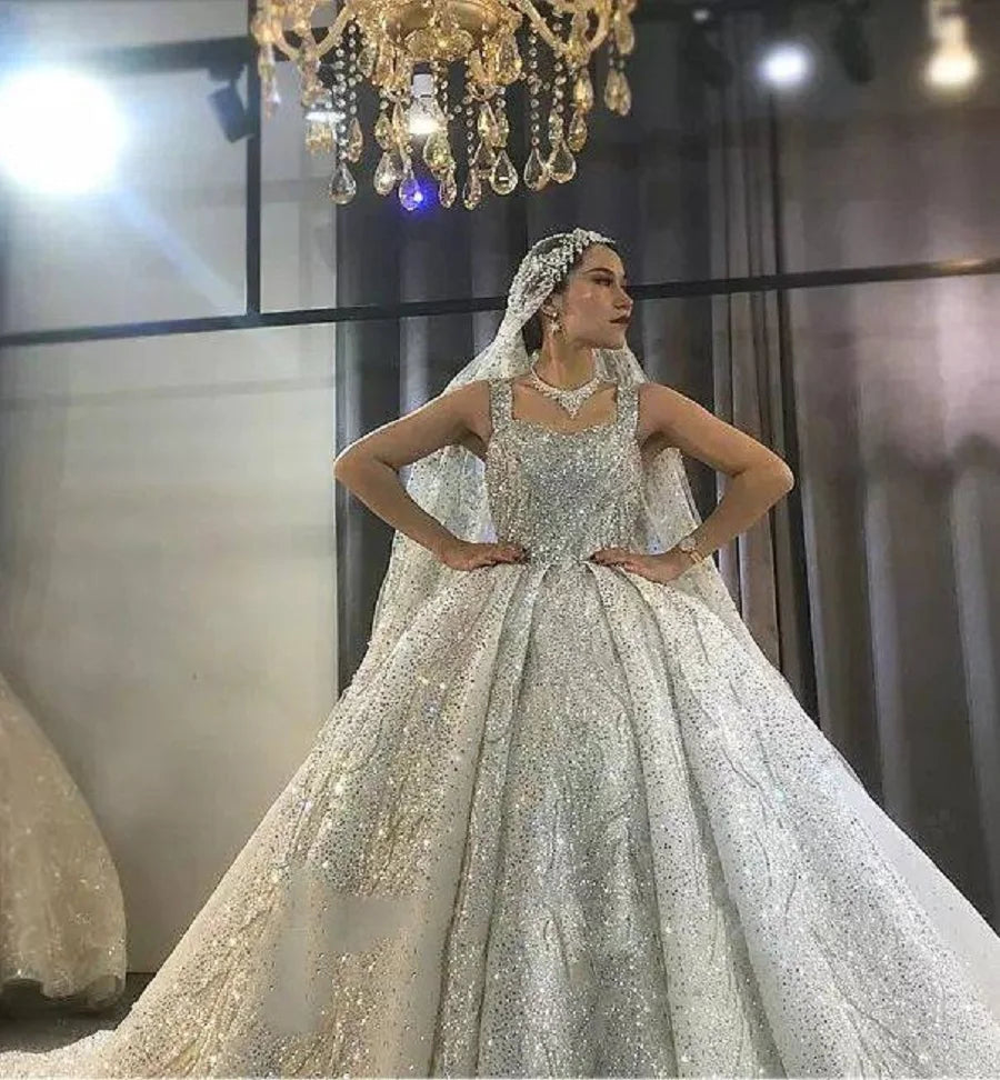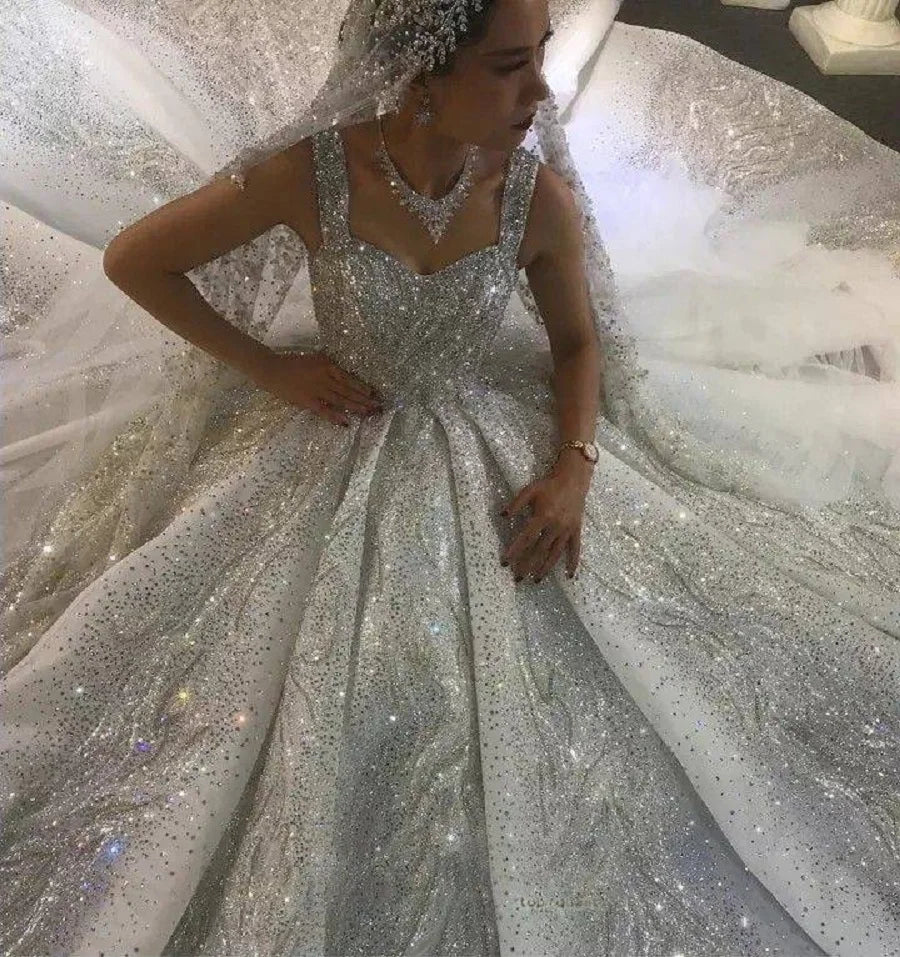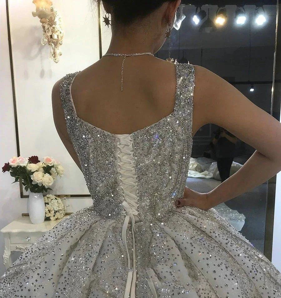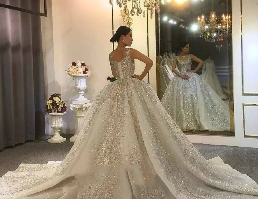 Luxurious Sparkling Sequin Wedding Dress Ball Gown Sleeveless Long Rhinestone Bridal Dress With Court Train Robes