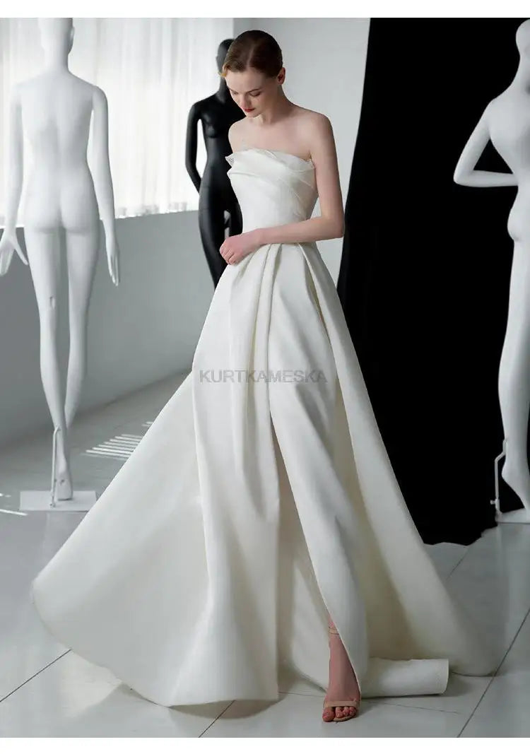 Luxury White Satin Trailing Wedding Dresses Women Elegant Strapless Long Prom Party Bridal Dress