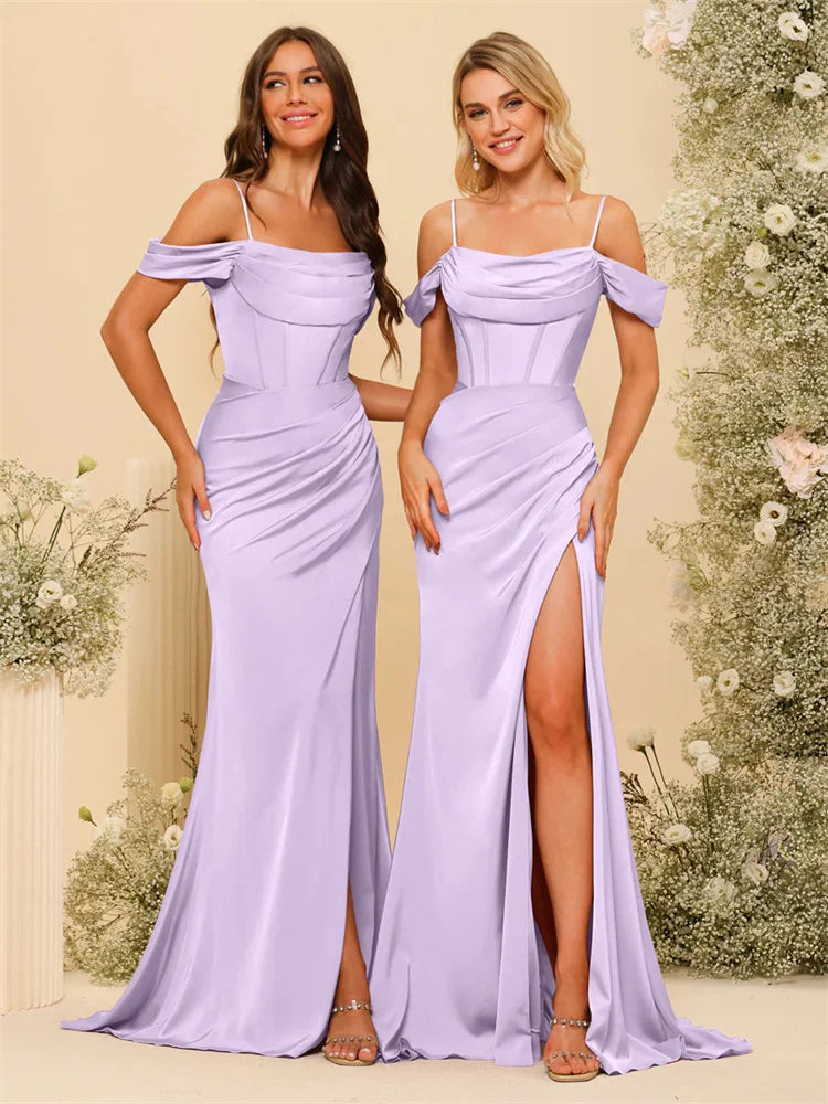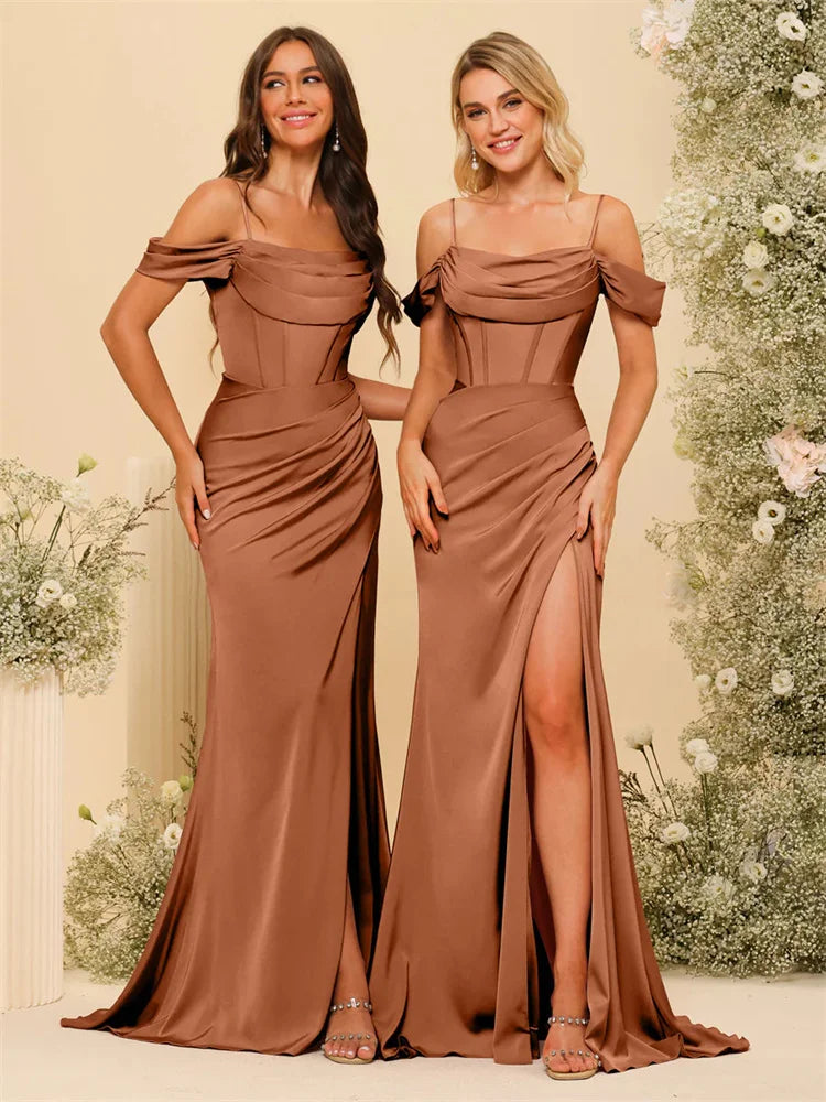 Pay in 4 instalments with AfterPay, Buy Now Pay LaterOff-the-Shoulder Spaghetti Straps Silk Satin Sheath Bridesmaid Dress Elegant Zipper Back Gowns For Wedding Guests