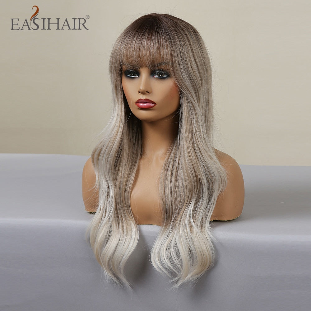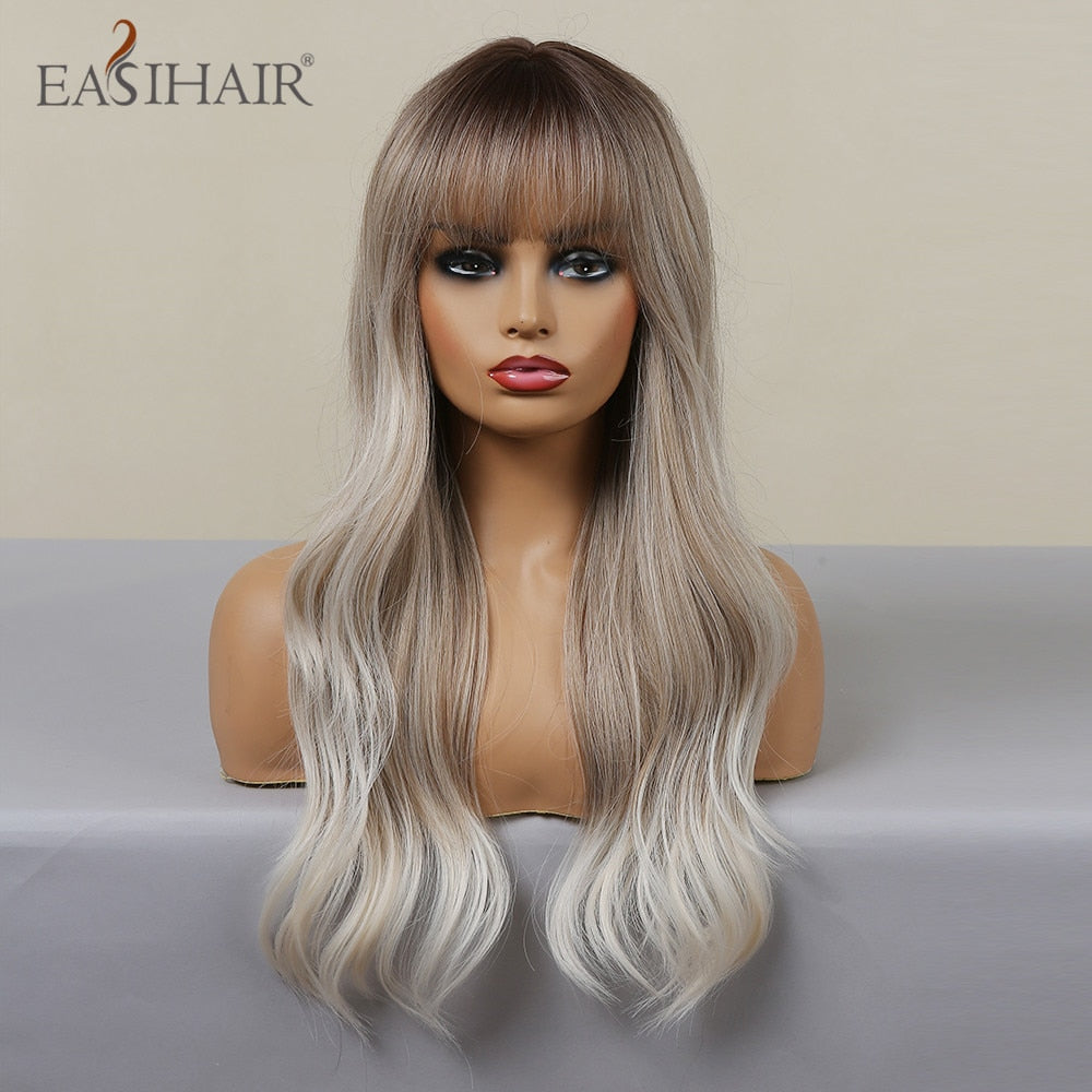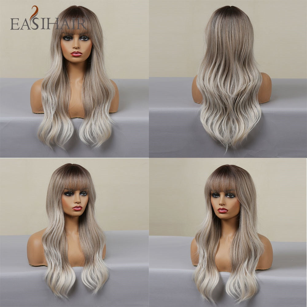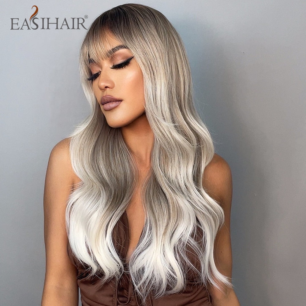 Ombre Gray Ash Wavy Wigs with Bang Light Blonde Platinum Synthetic Long Hair for Women Daily Party Heat Resistant Fiber Wigs
