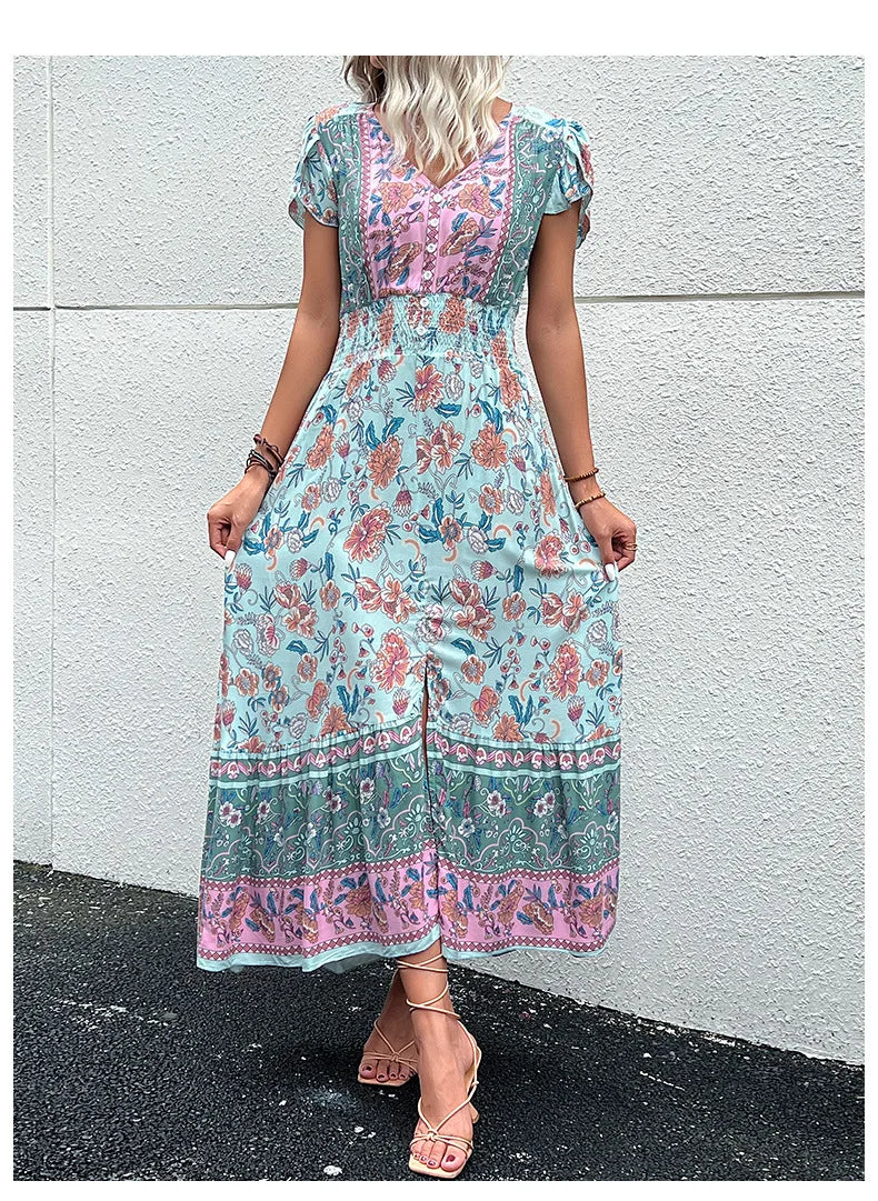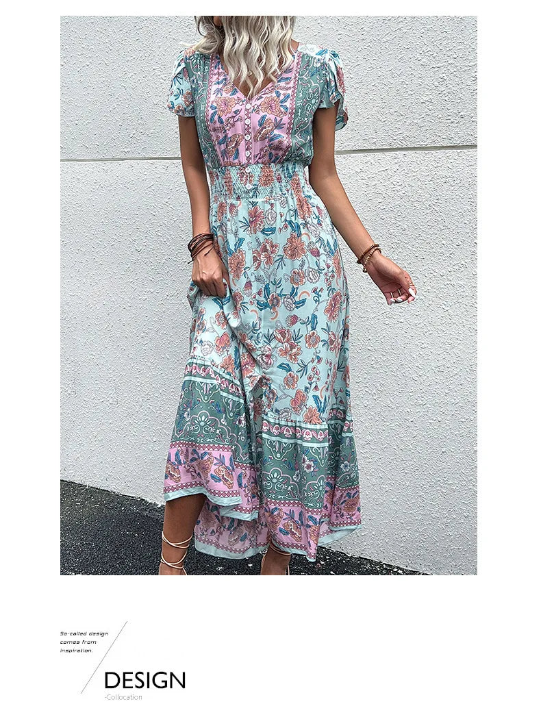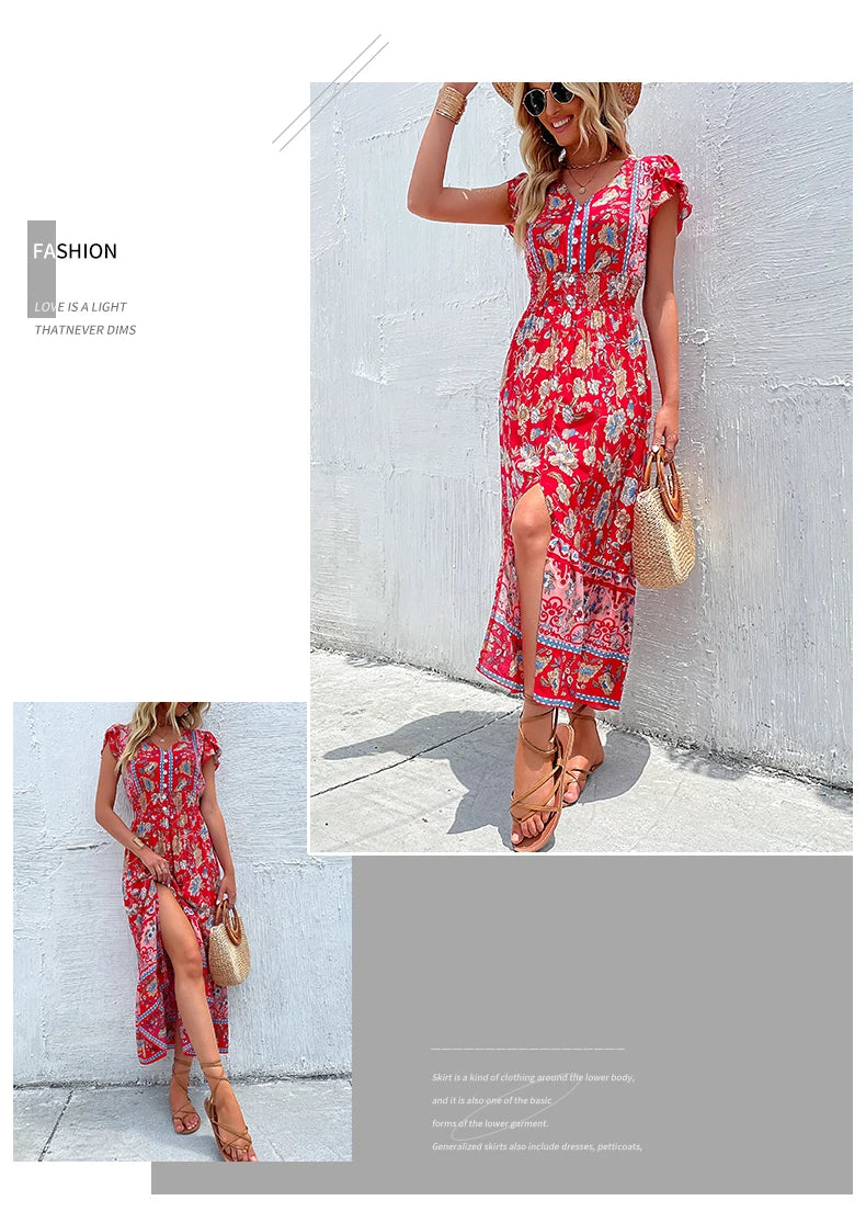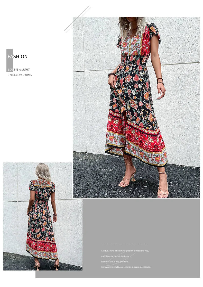 Short Sleeves V Neck Vintage Floral Boho Printed Slit Midi Dresses A Line Bohemian Summer Beach Dress
