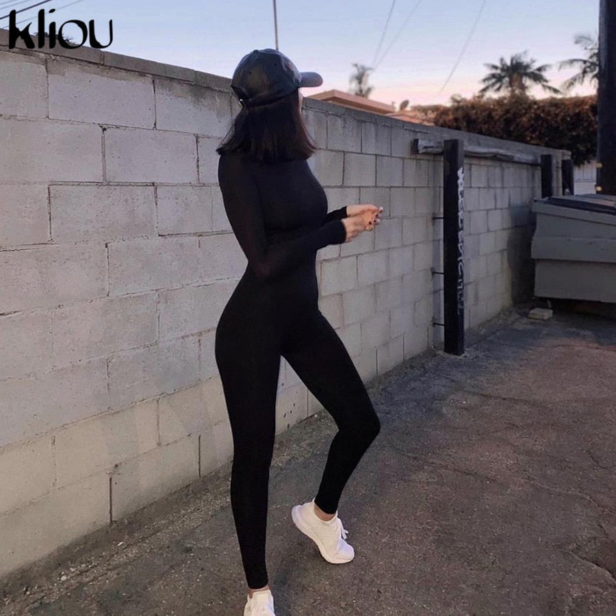 Solid black/gray long sleeve skiing jumpsuit women elastic hight outfit fashion fitness sportwear slim rompers streetwear