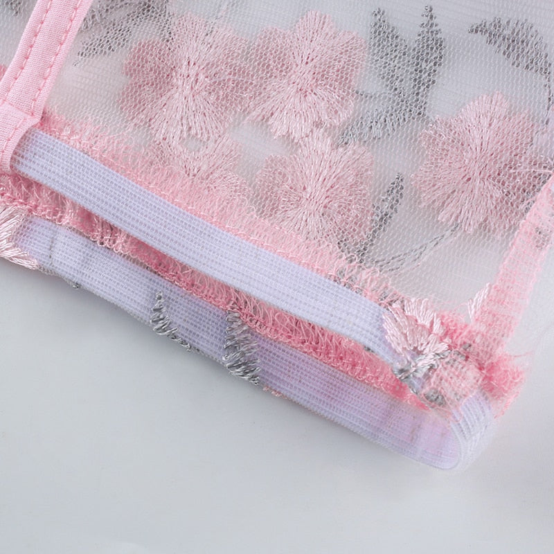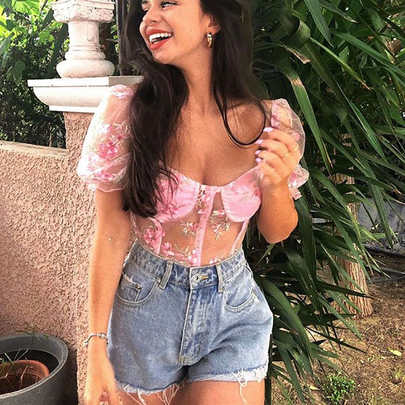 Square Neck Pink Mesh Embroidery Transparent Cropped Bustier Top Summer Shirt Puff Sleeve Blouse