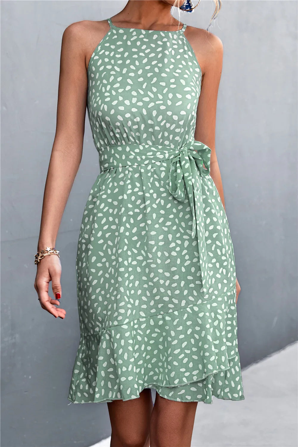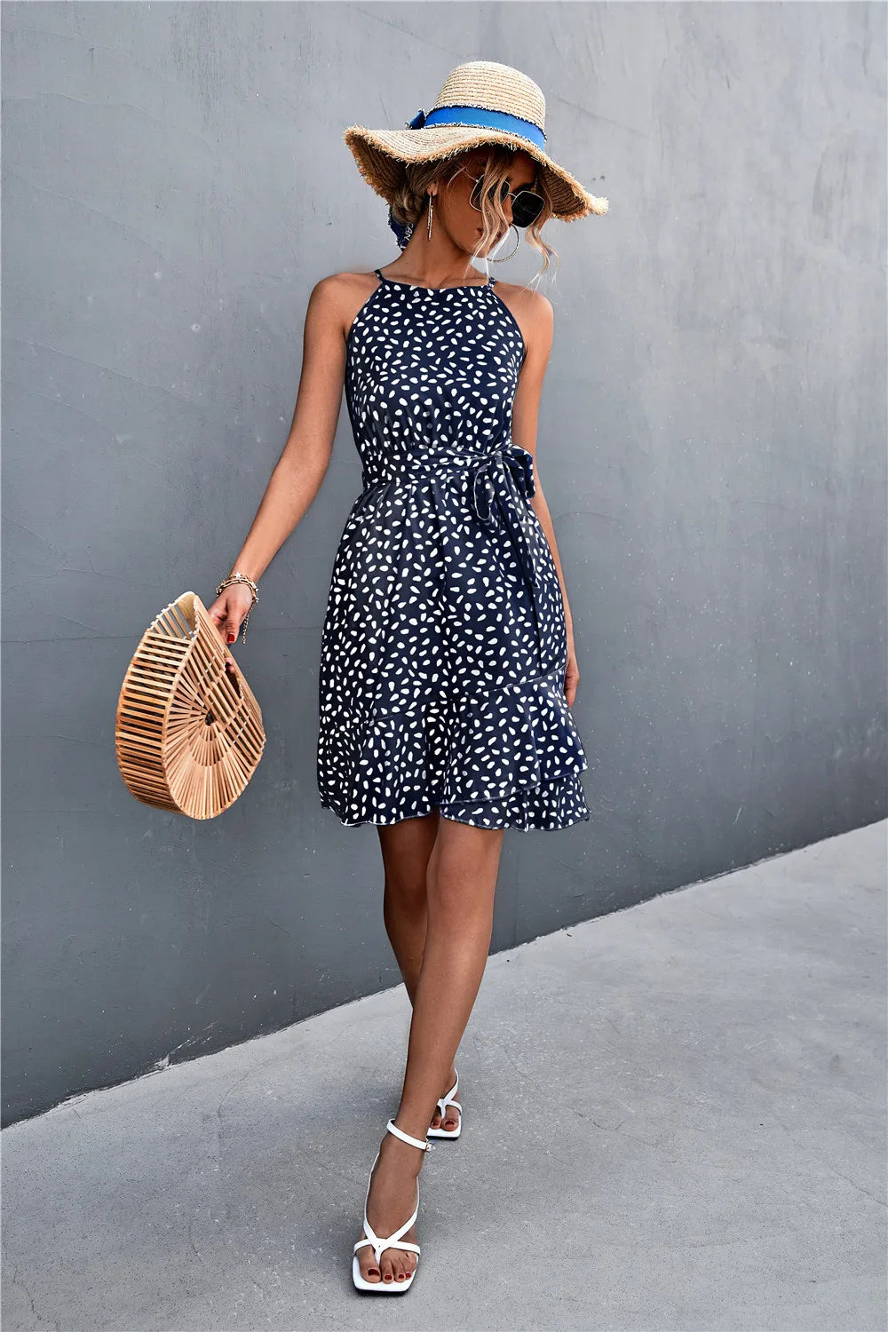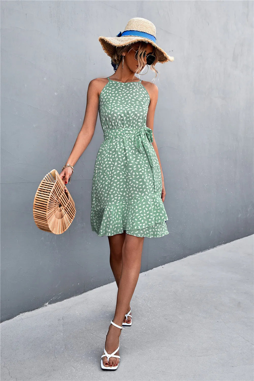 Summer Boho Women Floral Print Mini Spaghetti Strap Short Dress Ladies Lace Up Slim Sleeveless Dress