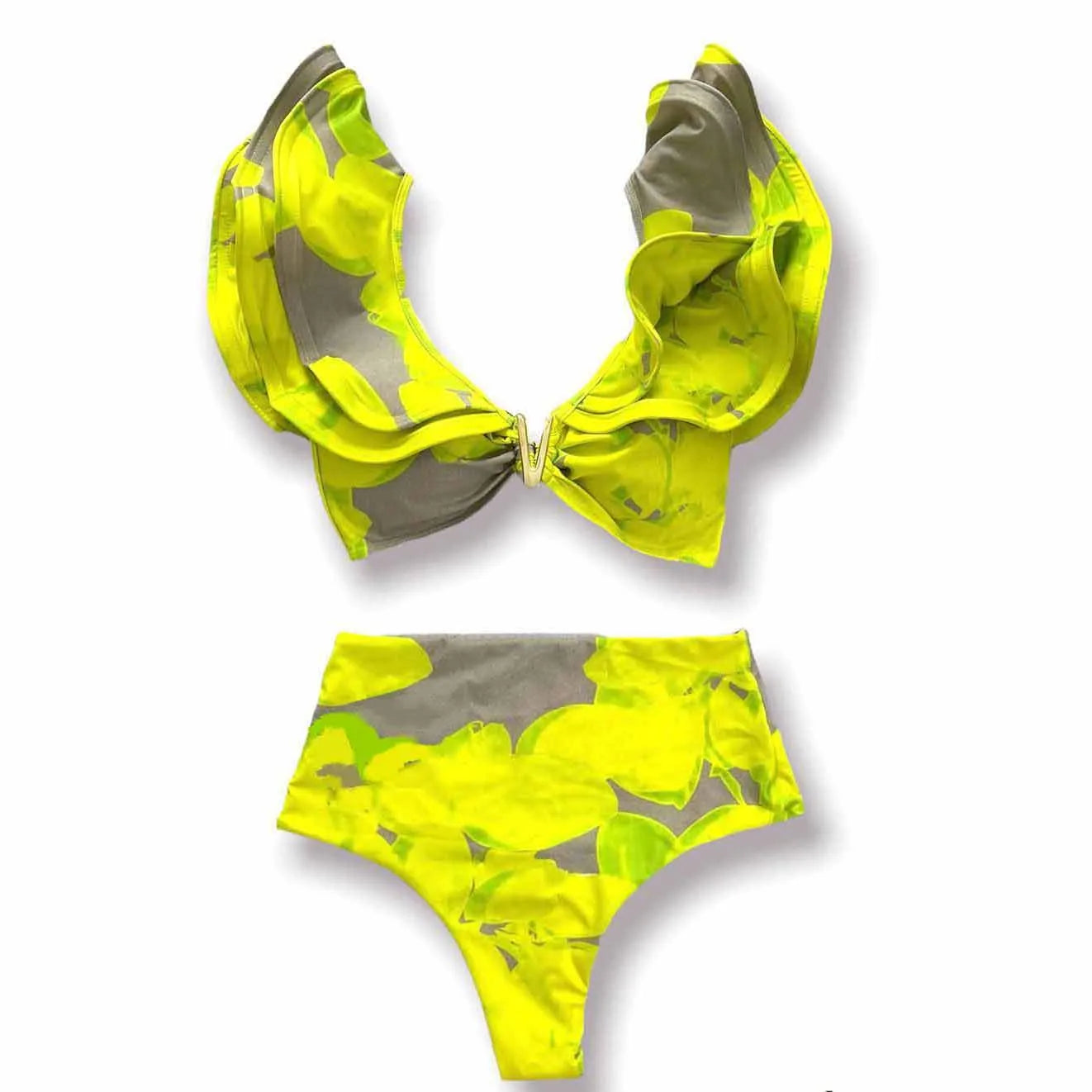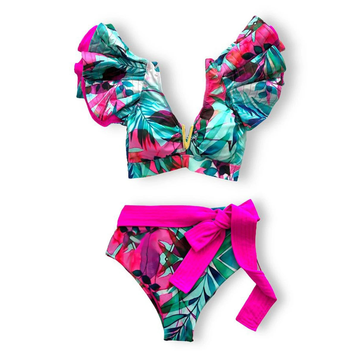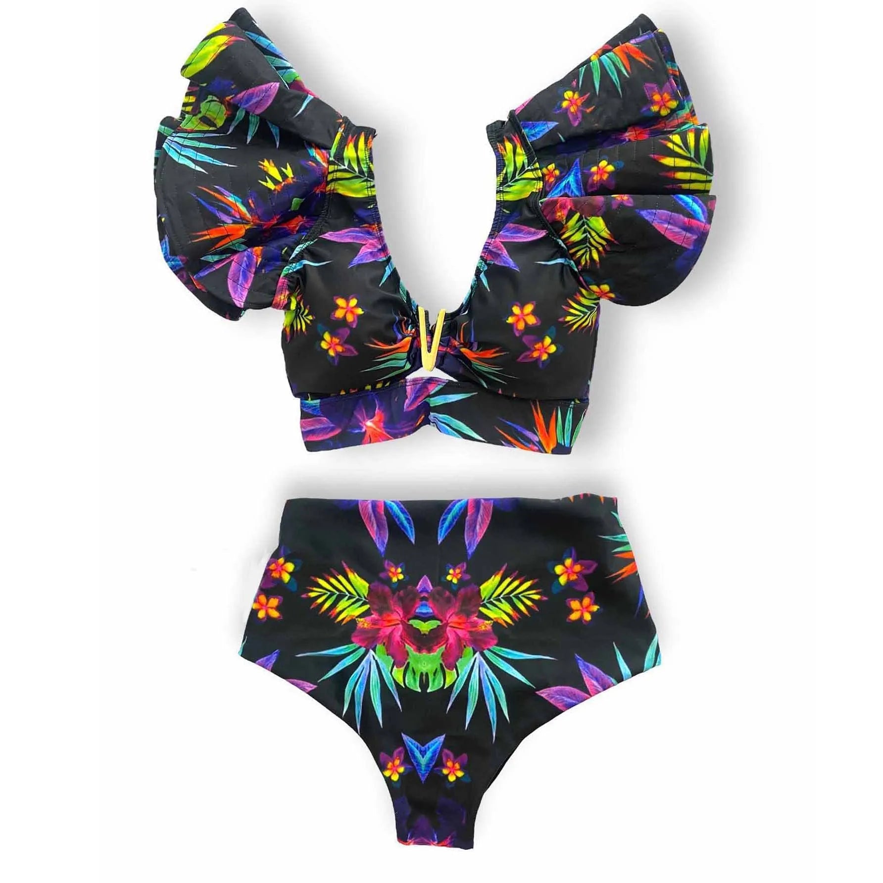 V-Neck High Waist Bikini Shoulder Ruffled Printed Swimsuit Two Piece Swimwear Bathing Suits