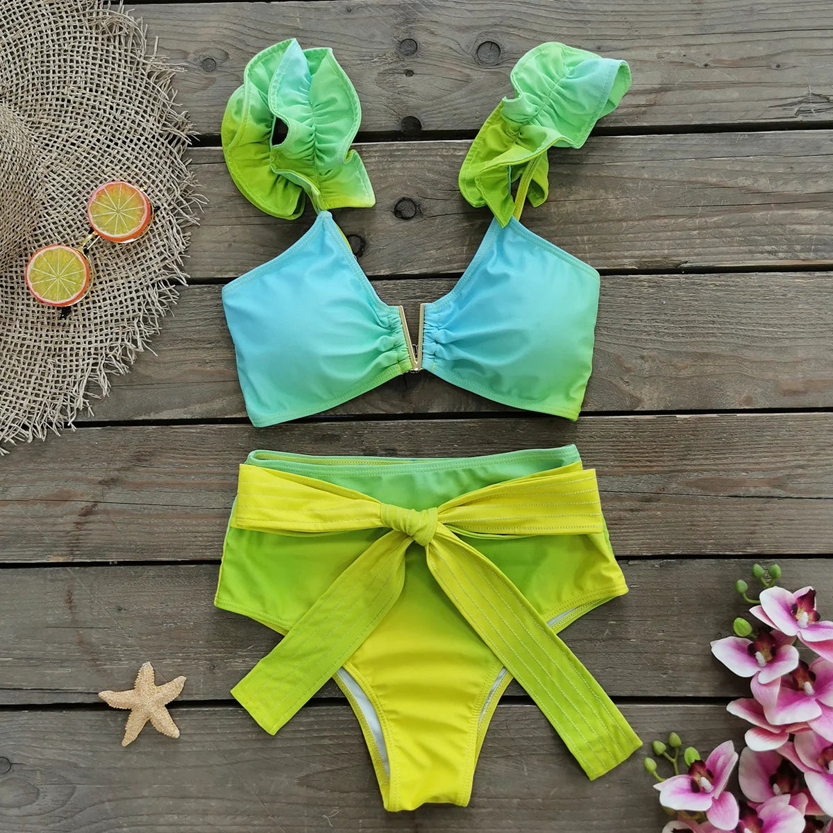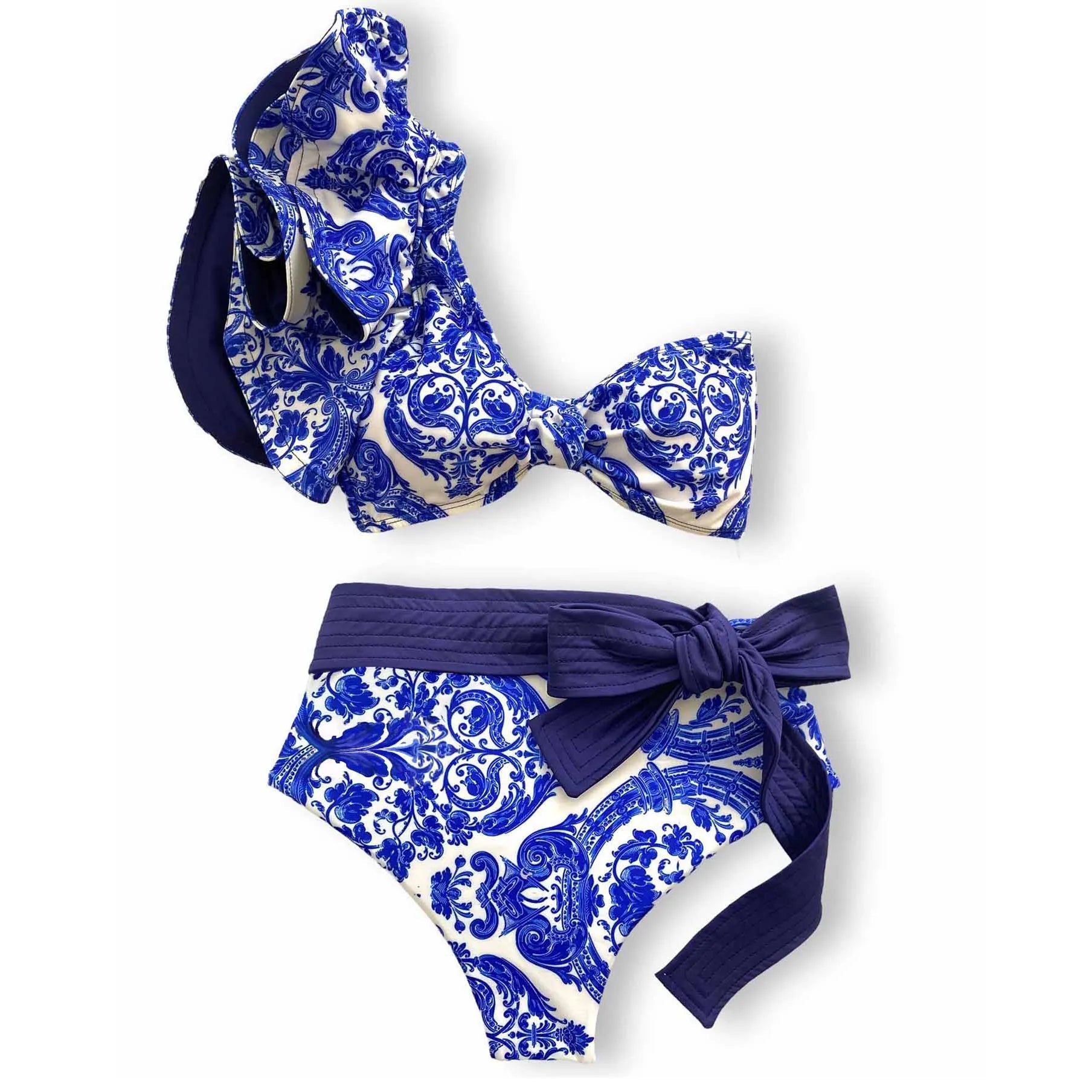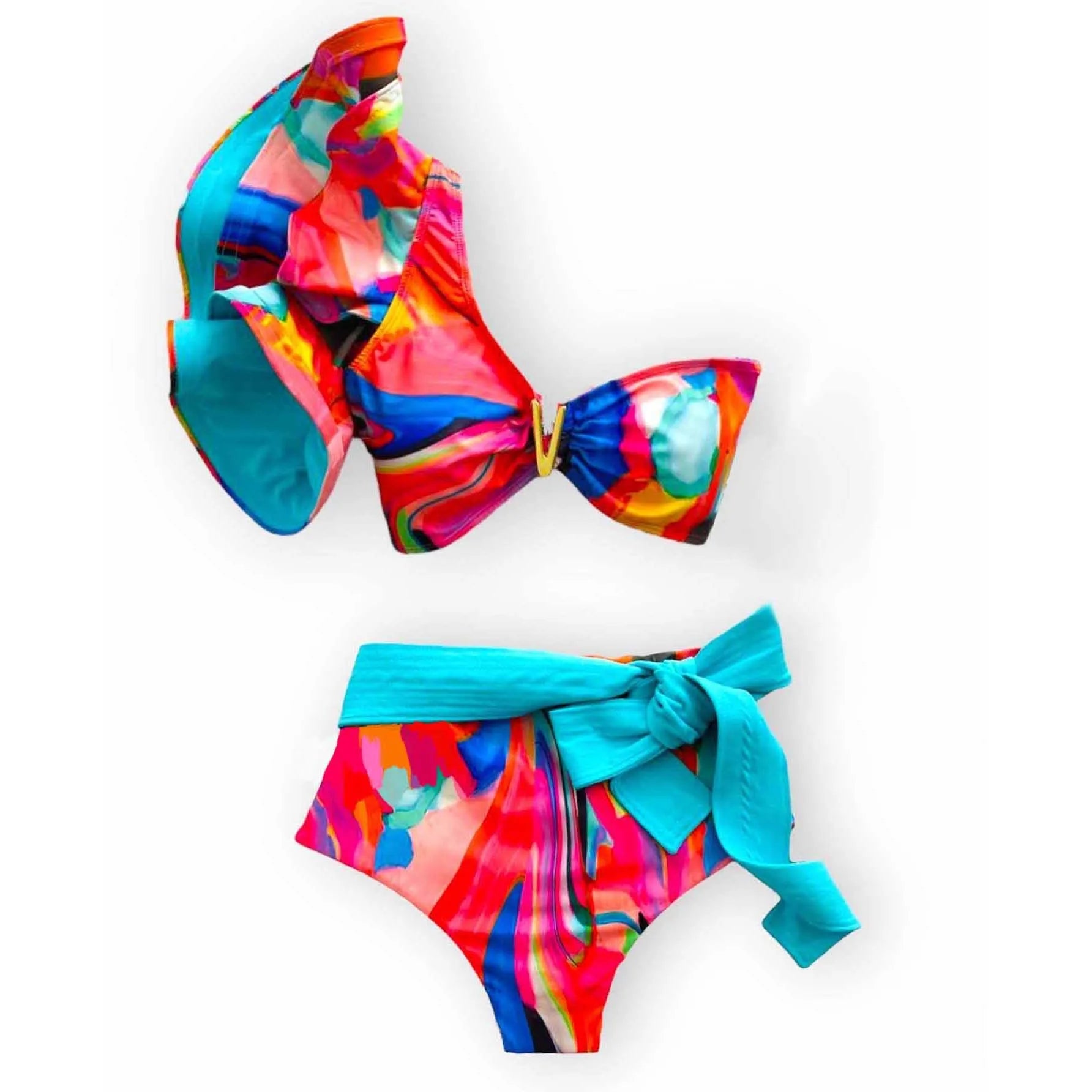V-Neck High Waist Bikini Shoulder Ruffled Printed Swimsuit Two Piece Swimwear Bathing Suits