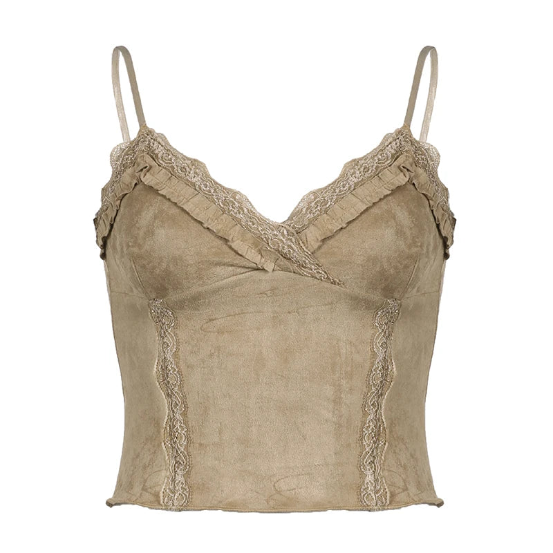 V Neck Strap Lace Trim Frill Suede Vintage Y2K Top Camisole Fashion Ruffles Party Summer Crop Top