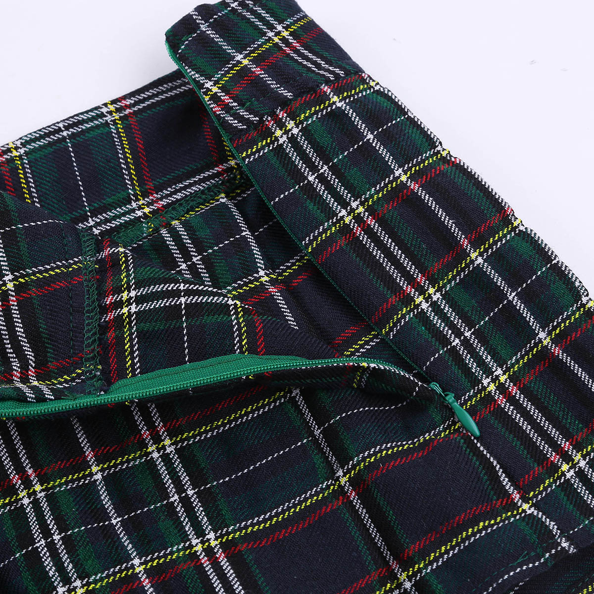 Short plaid pleated miniskirt with side zipper or hook and loop fasten closure.
